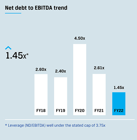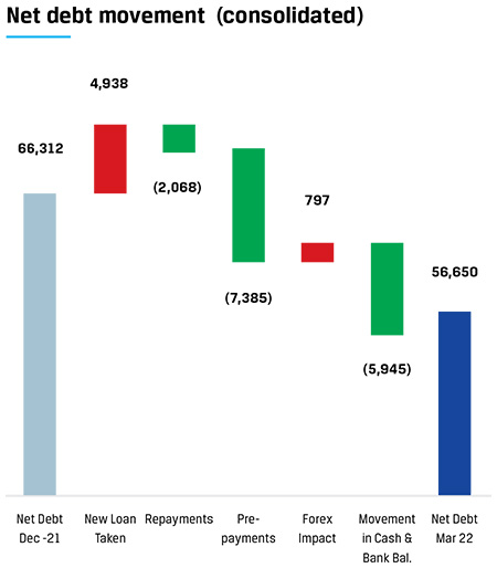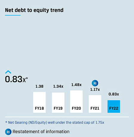 At the end of FY 2021-22, our total debt stood at `56,650 crore, with our net gearing (ND/Equity) well under the stated cap of 1.75x and leverage (ND/EBITDA) under the stated cap of 3.75x.