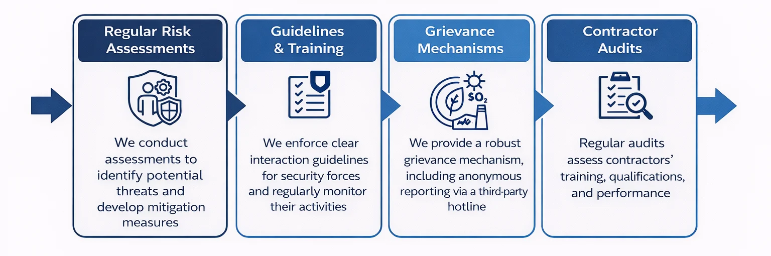 We recognize the vital role businesses play in safeguarding human rights. To drive meaningful action, we concentrate on areas where our operations and value chains intersect with human rights. These focus areas are continuously monitored and strengthened through rigorous due diligence, regular employee and community feedback, and independent third-party evaluations.