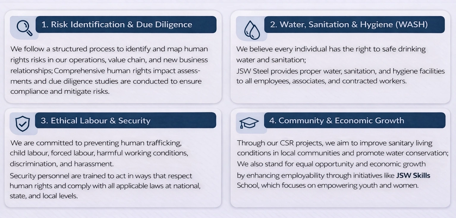 At JSW, human rights are embedded into our business practices through a structured approach that prioritizes safe workplaces, fair labour practices, community well-being, ethical governance, and data privacy. We focus on creating inclusive and equitable work environments, eliminating child labour and strengthening supplier accountability, while ensuring access to health, sanitation, and livelihood opportunities for communities.