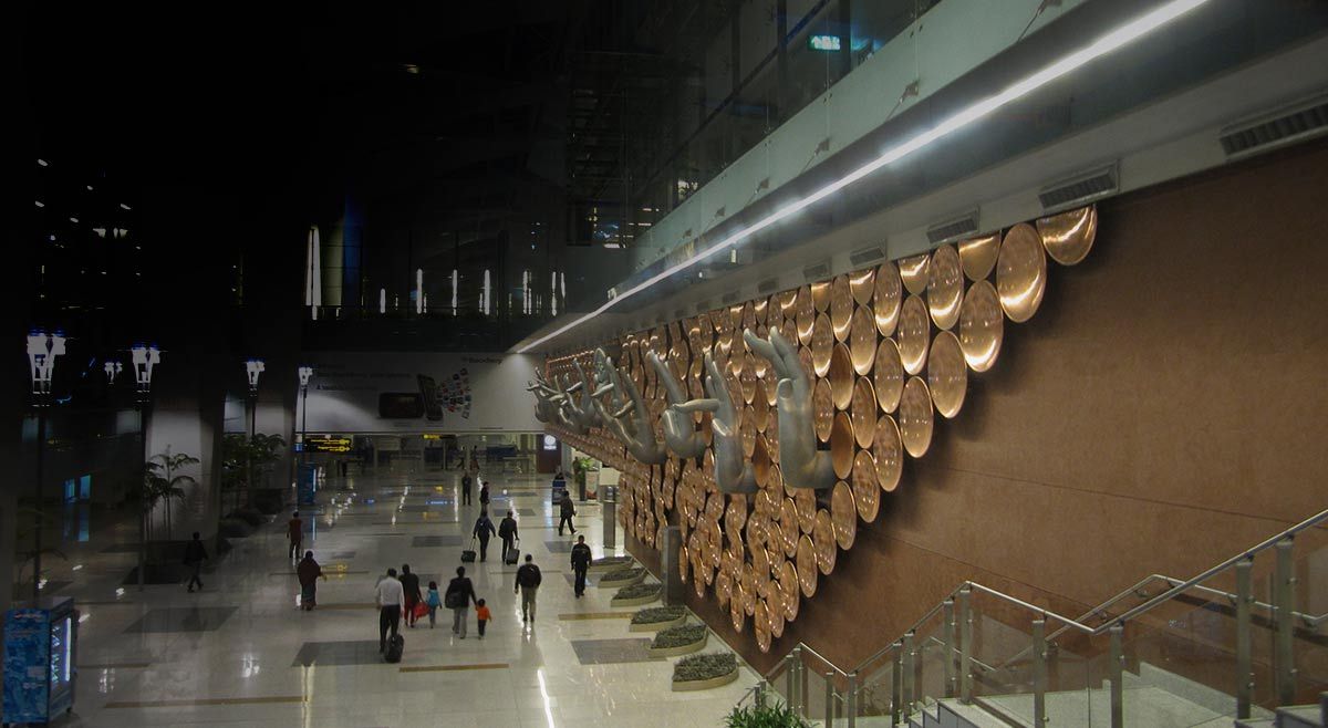 Built with a glass and metal frame structure,Terminal 3 is India’s first airport building to receive LEED Gold certification. Sustainable design strategies include a northern orientation that reduces solar gain, optimum use of natural light, interior finishes with high recycled content and battery-powered vehicles for moving travelers between terminals. The water management and treatment program features more than 300 rainwater harvesting pits.