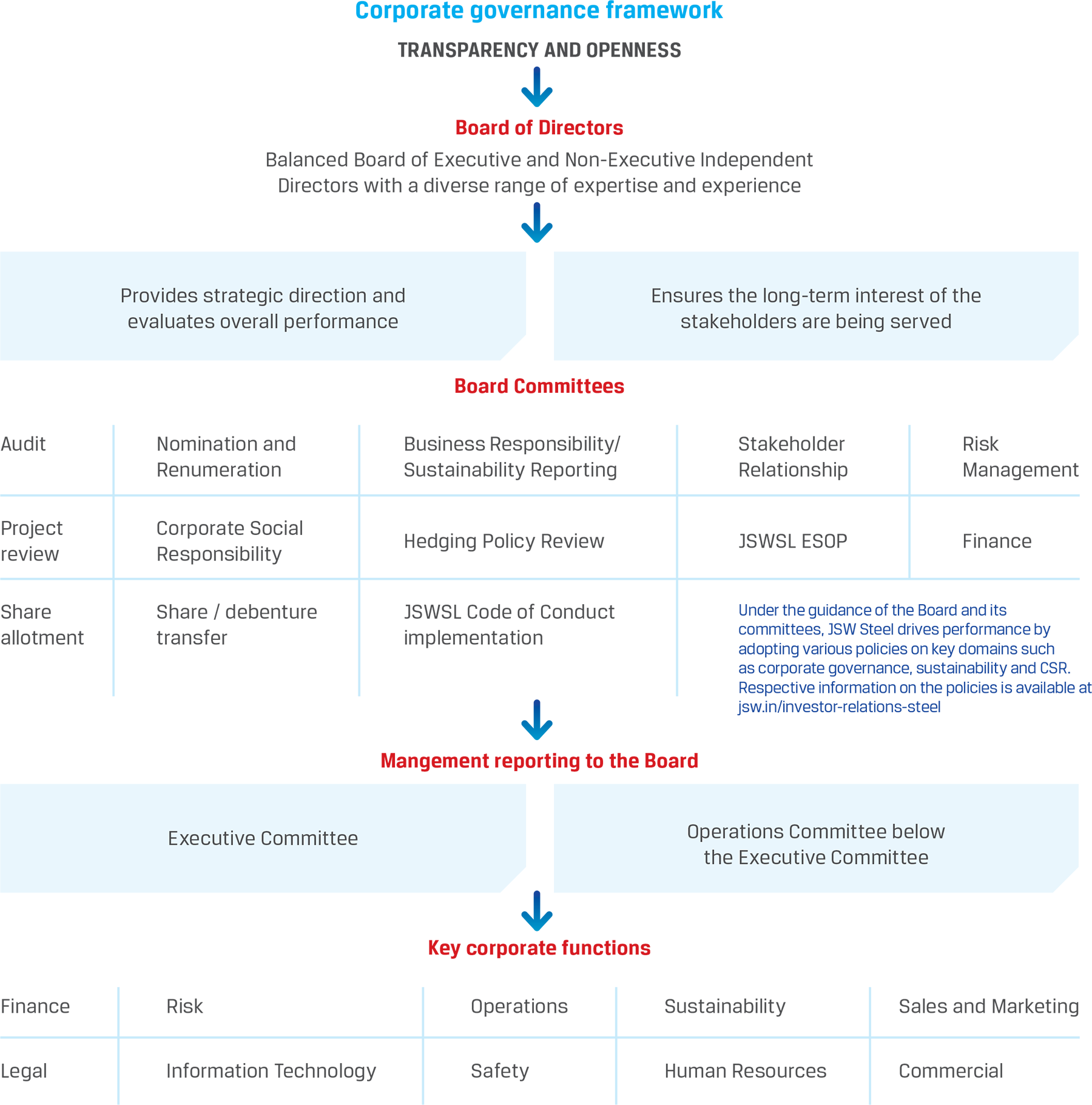At JSW Steel, our policy on business conduct demonstrates our commitment to embed sound governance, deliver transparency, tackle corruption, manage risks. Our Board of Directors oversees our codes of conduct, overall corporate behaviour and integrity of the organisation.