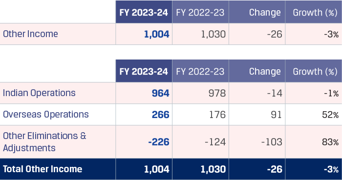 Other income was `1,004 crore in FY 2023-24 as compared to `1,030 crore, lower by `26 crore. Other income was lower due to one-time gain on deemed disposal on dilution of stake in a joint venture of `135 crore, and insurance claim of `30 crore. The decrease is partially offset by increase in interest income from bank deposits by `143 crore.