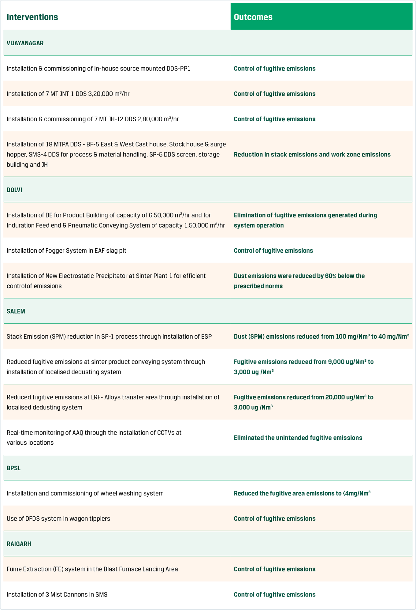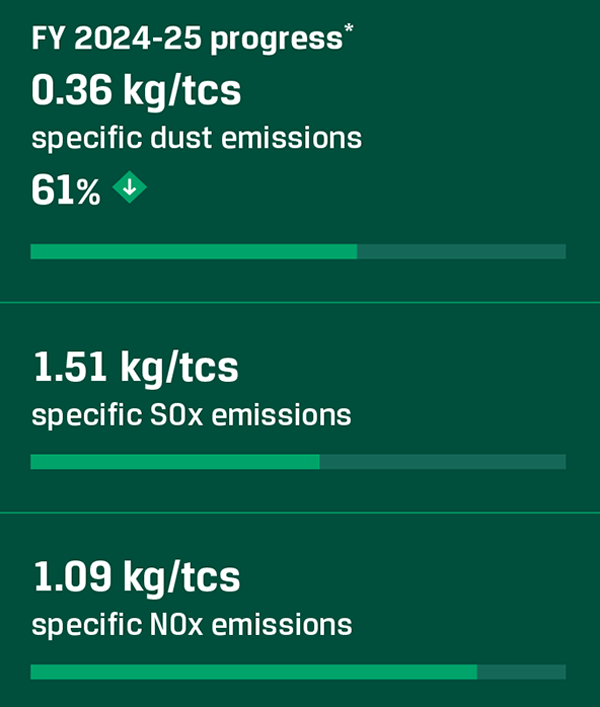 Our strategy targeted at reducing air emissions is integrated; it transcends process spaces and encompasses improved materials handling and logistics. To this end, we increased our covered storage facilities at strategic locations, minimising dust generation in handling raw materials like coal, iron ore and fluxes. These covers, in combination with dust suppression schemes, have contributed significantly towards enhancing ambient air quality within and around our plants.