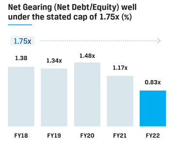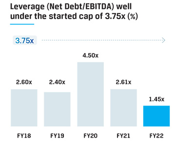 We continue to maintain a healthy balance sheet despite charting out large investments to expand our capacity. On the back of healthy profitability in FY 2021-22, both our Net Debt to Equity and Net Debt to EBITDA ratios have declined and are comfortably placed at 0.83x and 1.45x, respectively. With new capacities coming on stream driving volume growth, we are well placed to maintain our Net Debt to EBITDA ratio well below 3.75x.