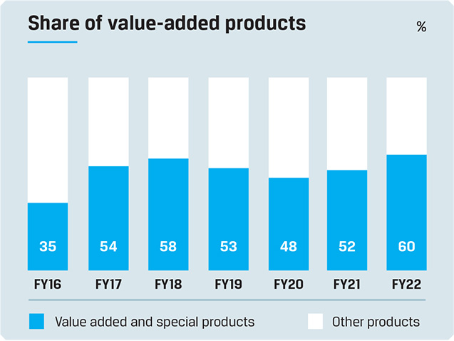 In line with the evolving needs of our customers, we have continuously innovated and introduced new products in the market, and progressively increased our share of Value-Added and Special Products (VASP) in our portfolio. Our products across categories such as hot rolled, cold rolled, colour coated, electrical steel, alloy steel and tinplate find varying applications across industries. Our brands enjoy continued goodwill in the market given the assured quality and advanced applicability. We have also been able to understand the pulse of the market and develop first-to-market product solutions in domestic market.